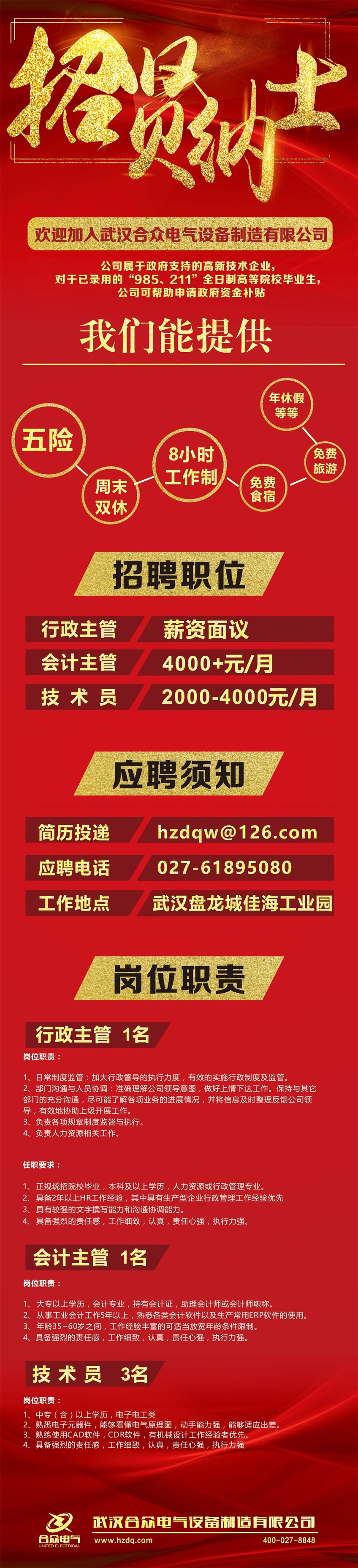 武漢市合眾電氣設備制造有限公司成立于2002年,注冊資金2100萬元,是一家專業生產和銷售電力檢測、試驗設備的高新技術企業。公司擁有大批多年從事高電壓試驗、檢測設備設計、生產的專業技術人才,嚴格按照國際化標準管理企業,嚴格執行ISO9001國際質量體系標準,堅持不斷改革、創新。經過多年積極努力經營,已成長為一家集科研、開發、生產、銷售、服務為一體的高科技現代電力設備生產企業,獲得行業眾多榮譽,得到行業一致認可。公司重視人才的培養,定期為員工提供專業的技能培訓,為每位員工提供廣闊的發展平臺,現因公司的業務的拓展和規模的擴大,現招募以下職位,歡迎各位滿足條件的朋友踴躍報名,一經錄用待遇從優!