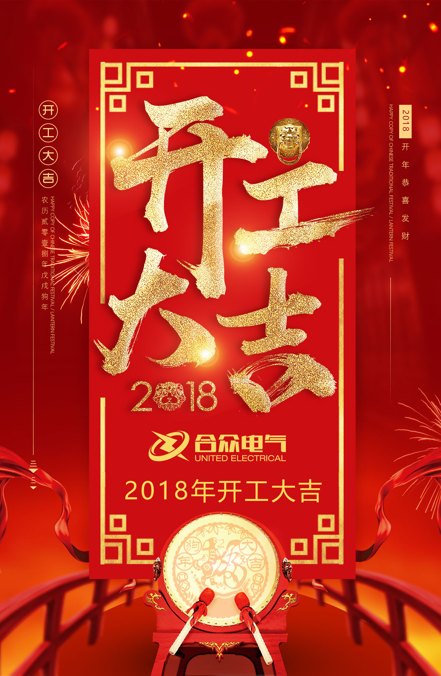 伴隨著新年鐘聲的敲響,2017年已經過去,歷史的車輪駛入了2018年!2018年2月23日(正月初八)武漢市合眾電氣設備制造有限公司今天正式開工啦,各項業務進入正常運作,繼續為廣大客戶朋友們服務。在此合眾電氣向廣大合眾客戶及其家人致以新年的祝福,對在過去的一年里給予的積極合作與支持表示衷心的感謝!祝大家在新的一年里身體健康,萬事如意,希望你們一如既往的支持公司的各項工作!