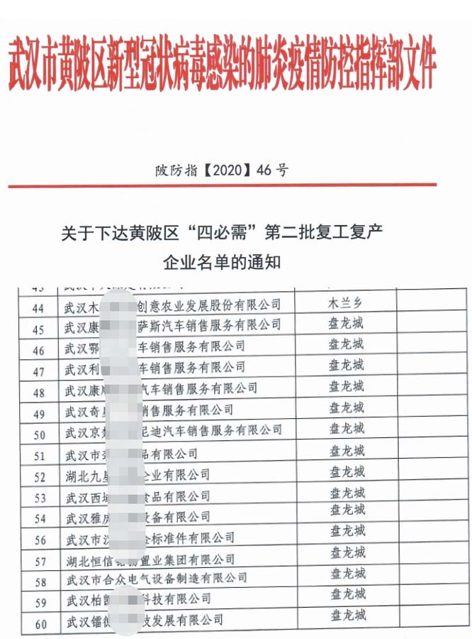 經(jīng)過(guò)黃陂區(qū)疫情防控指揮部的批準(zhǔn),在黃陂區(qū)管委會(huì)及區(qū)經(jīng)濟(jì)和信息化局的協(xié)調(diào)和大力支持下,武漢市合眾電氣收到了黃陂區(qū)“四必需”第二批復(fù)工復(fù)工企業(yè)名單的通知。