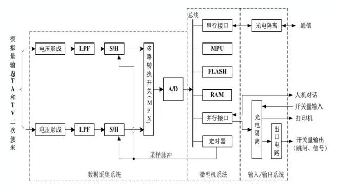(2)CPU主系統:微處理器、只讀存儲器(ROM)或閃存內存單元、隨機存取存儲器(RAM)、定時器、并行以及串行接口等。微處理器通過執行編制好的程序,完成各種繼電保護測量、邏輯和控制功能。(3).開關量(數字量)輸入/輸出系統:并行接口(PIA或PIO)、光電隔離器件及有觸點的中間繼電器等組成,完成保護的出口跳閘、信號、外部接點輸入及人機對話等功能。