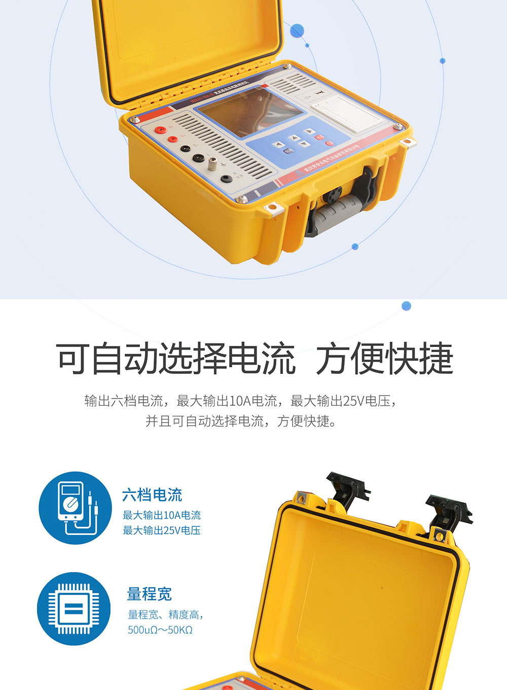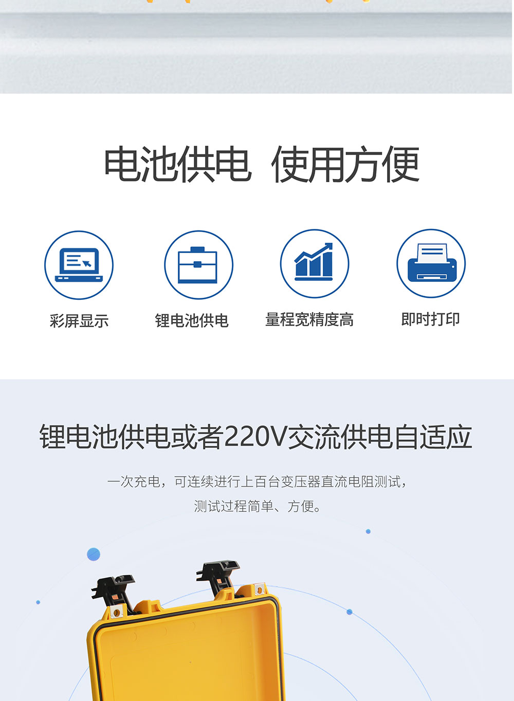 1、鋰電池供電或者220V交流供電自適應(yīng),一次充電,可連續(xù)進(jìn)行上百臺(tái)變壓器直流電阻測(cè)試,測(cè)試過(guò)程簡(jiǎn)單、方便。