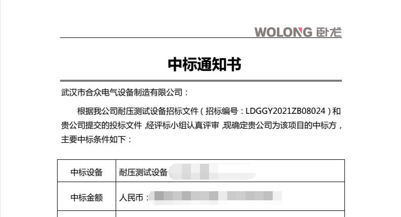 武漢市合眾電氣中標(biāo)臥龍電氣耐壓測(cè)試試驗(yàn)項(xiàng)目