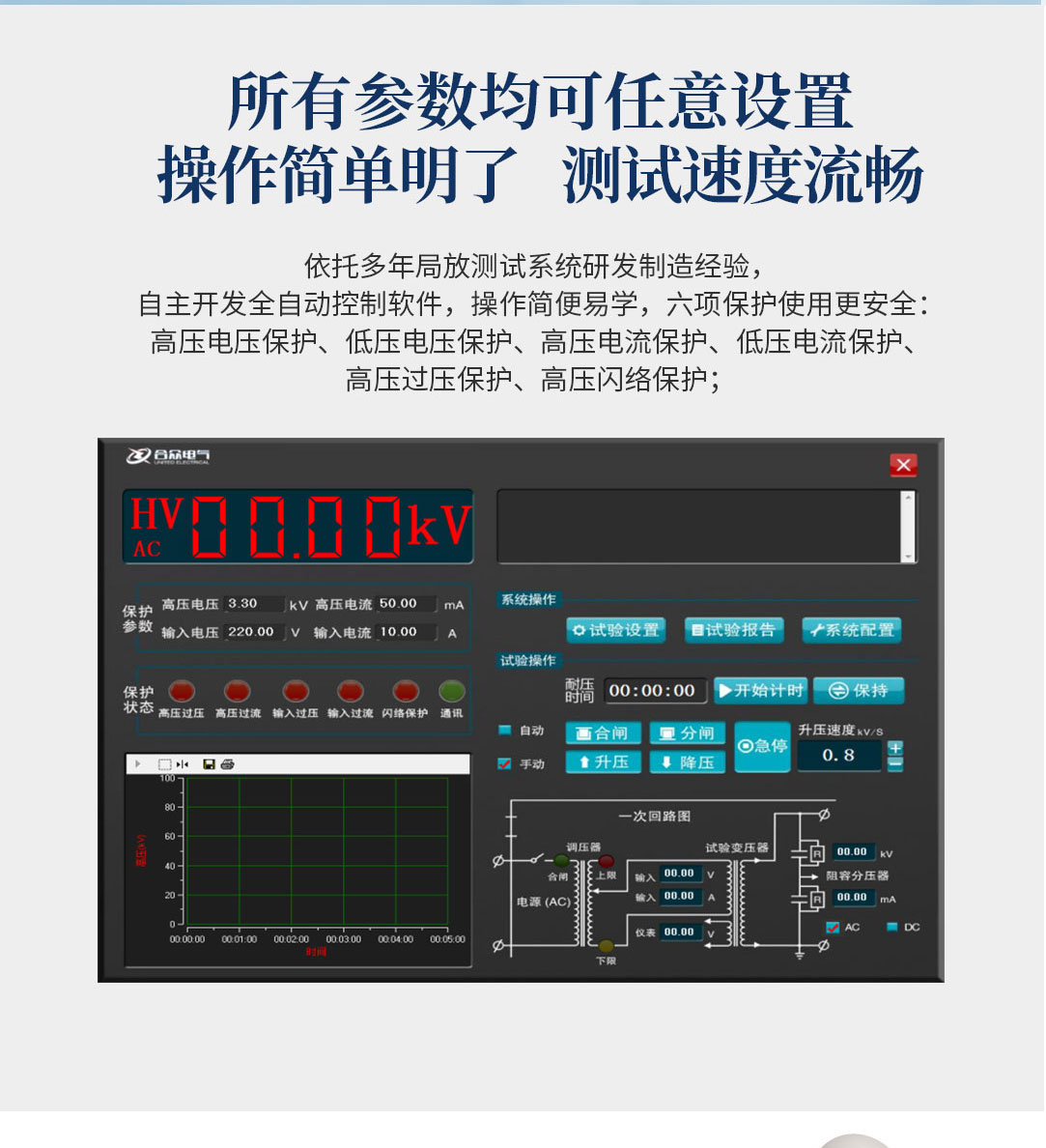 6、所有測(cè)試參數(shù)可提前進(jìn)行設(shè)置,能達(dá)到高壓電壓放電擊穿電壓準(zhǔn)確記憶、儲(chǔ)存、復(fù)位一系列功能;自動(dòng)掃描時(shí)間設(shè)定,自動(dòng)存儲(chǔ)電老化過程中的時(shí)間、電壓、電流等詳細(xì)記錄,方便用戶查看;