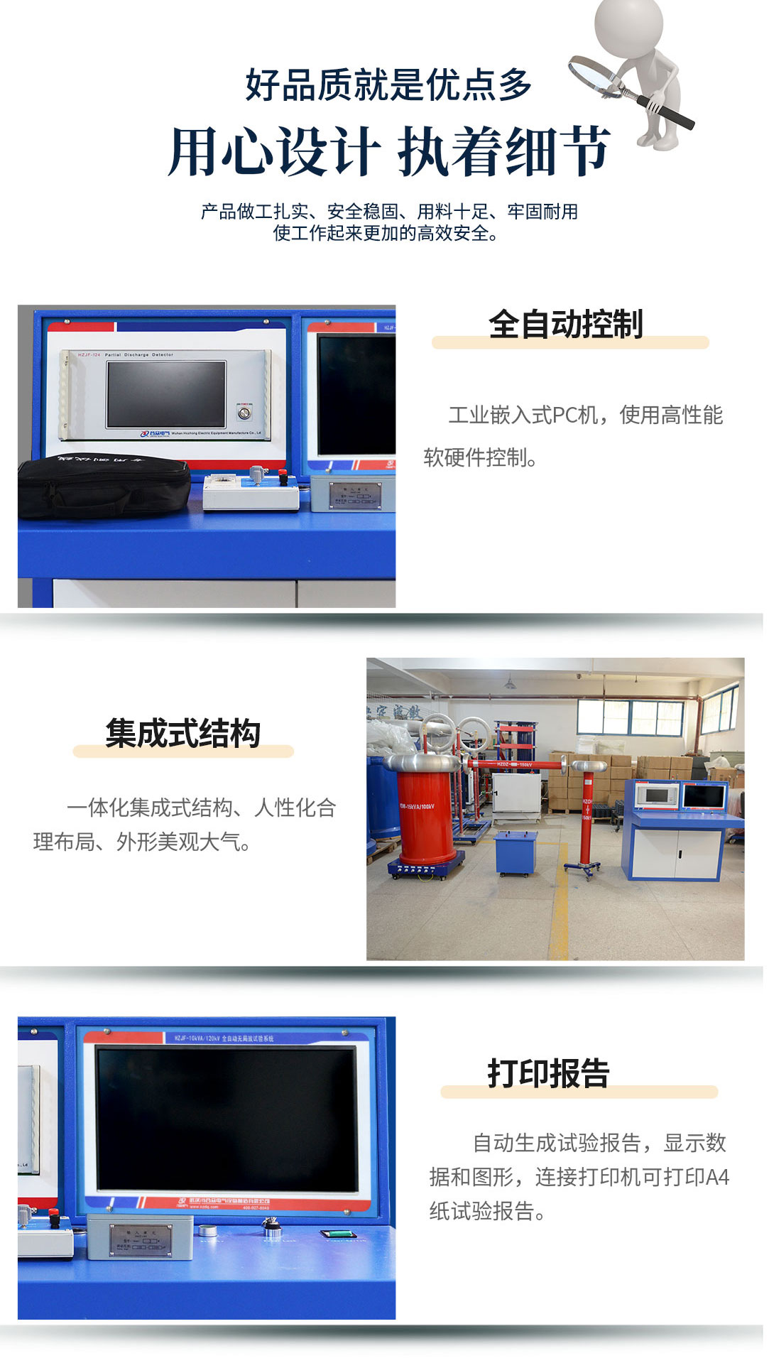 該試驗(yàn)裝置適用于供配電系統(tǒng),電力變壓器制造廠、工礦企業(yè)、科研部門等,對(duì)各種高壓電氣設(shè)備、電器元件、絕緣材料進(jìn)行工頻或直流高壓下的絕緣強(qiáng)度試驗(yàn),是高壓試驗(yàn)中不可少的重要設(shè)備。巧妙的將無局放試驗(yàn)裝置(變壓器控制部分)和局部放電檢測(cè)儀結(jié)為一體,外觀亮麗輕巧,使測(cè)試過程更加方便簡(jiǎn)單。