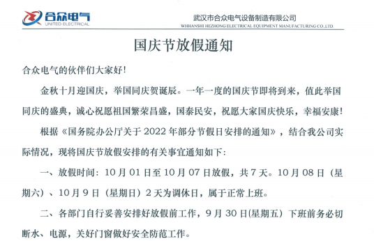 根據《國務院辦公廳關于2022年部分節假日安排的通知》,結合我公司實際情況,現將國慶節放假安排的有關事宜通知如下: