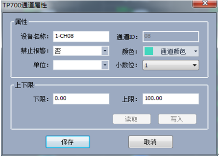 各個通道的參數(shù)可在設(shè)備管理區(qū)域內(nèi),選擇相應(yīng)的通道點擊鼠標(biāo)右鍵設(shè)備屬性進(jìn)行設(shè)置。如下圖2-13通道屬性設(shè)置,在此窗口內(nèi)可設(shè)置通道名稱,禁止報警,顯示顏色,通道單位,顯示小數(shù)位數(shù)等,并能夠向下位機(jī)讀取或者寫入通道的下限和上限等操作。
