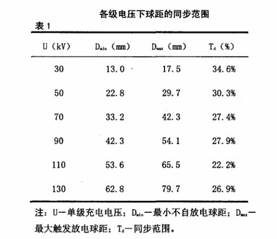 從表1可以看出,沖擊電壓發(fā)生器在各級(jí)電壓下的同步范圍均在20%以上,各級(jí)沖擊電壓下球距均有較好的同步特性,可以滿足沖擊試驗(yàn)的要求。
