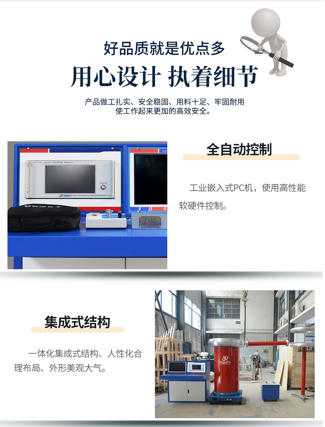 該工頻無局放試驗系統主要應用于電氣設備及絕緣材料的耐電壓強度及局部放電測試。一體化集成式結構、人性化合理布局、外形美觀大氣。執行標準:DL/T 848.3-2004。
